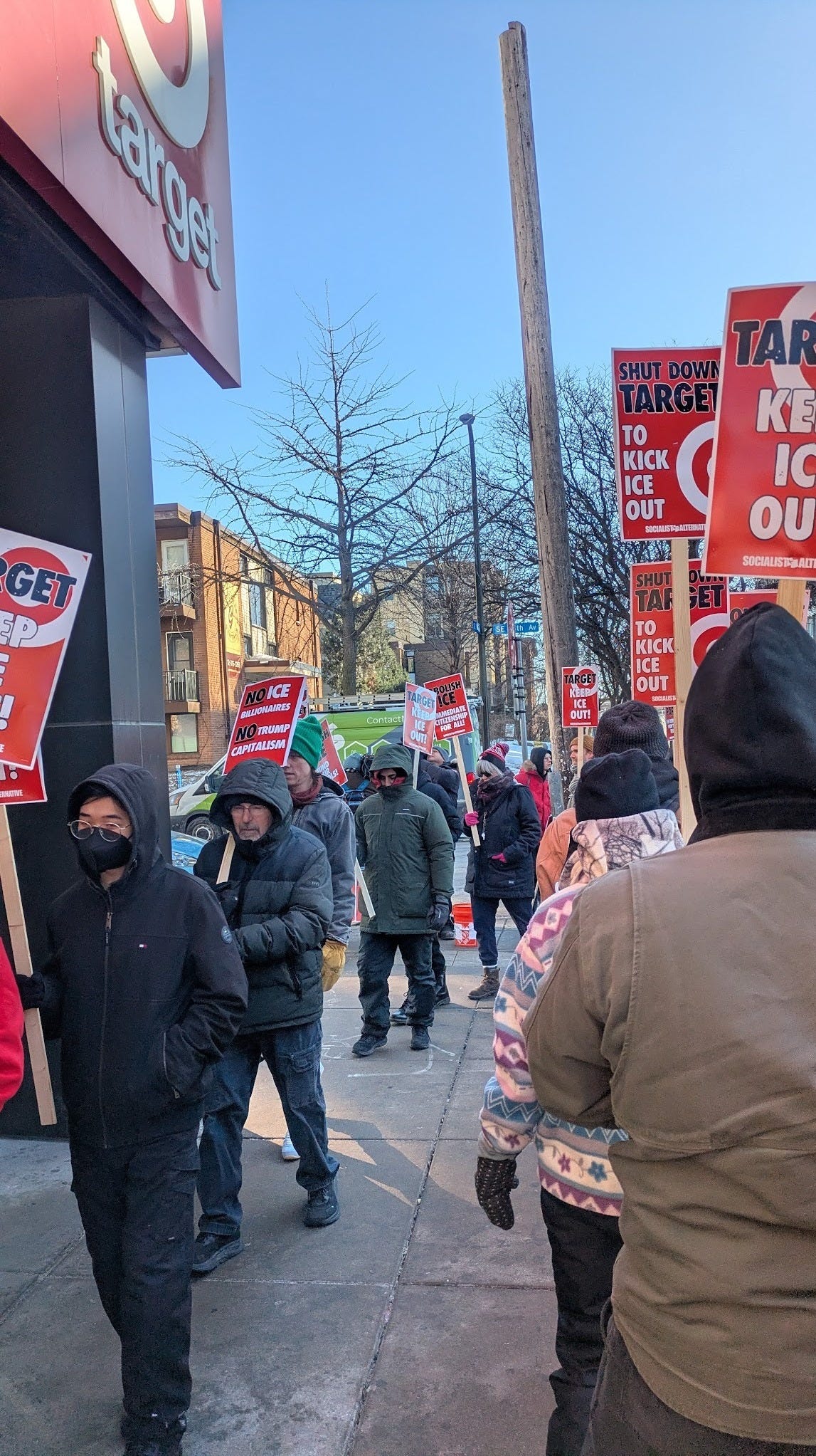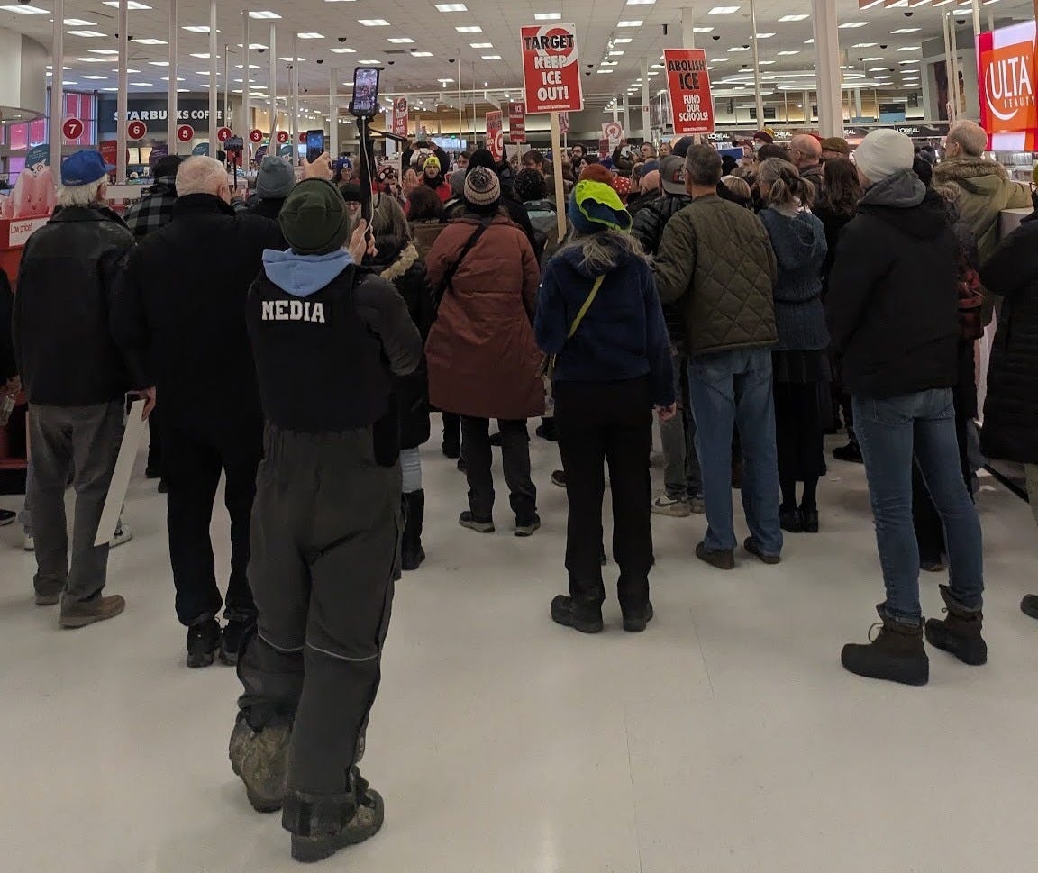 Target- I’m not really sure how exactly to describe this, but there is an ongoing campaign now to get Target to stop collaborating with ICE. It’s being led by Unidos, a non-profit out here that has long been in a collaborative relationship with SEIU. There are also other groups and community members joining in. I believe that more actions are coming that will be posted to the website linked above, iceoutnowmn.com. I went to two actions this past weekend, a picket held Friday outside of the Dinkytown Target by the left group Socialist Alternative, and a big protest inside of the Richfield Target on Saturday, led by Unidos. Both were pretty well-attended and raucous events, and the workers inside mostly had bemused faces. Target is a huge business out here and extremely anti-union, this struck me as something that labor should fully hop on to.